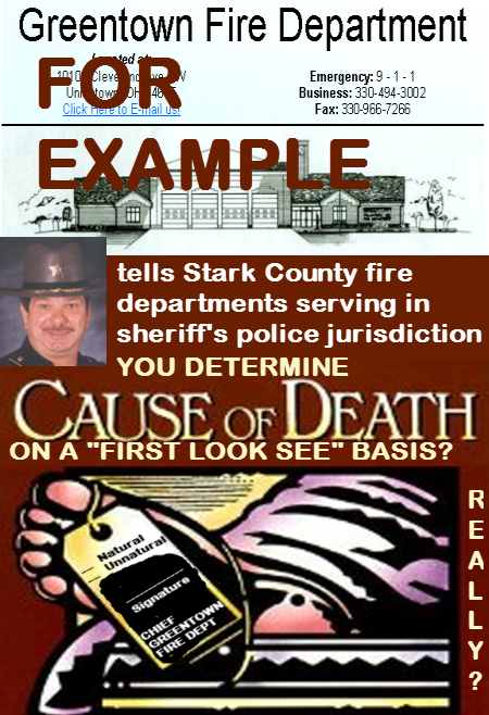 So, for example, it appears that the fire department chief of let's say from Greentown, (inasmuch as Greentown serves entirely within the police jurisdiction of the Stark County Sheriff's department) will have the Swanson-assigned responsibility to determine if a "victim" dead person was truly a victim or suffered a natural calamity merely on looking at the body.